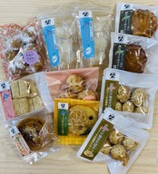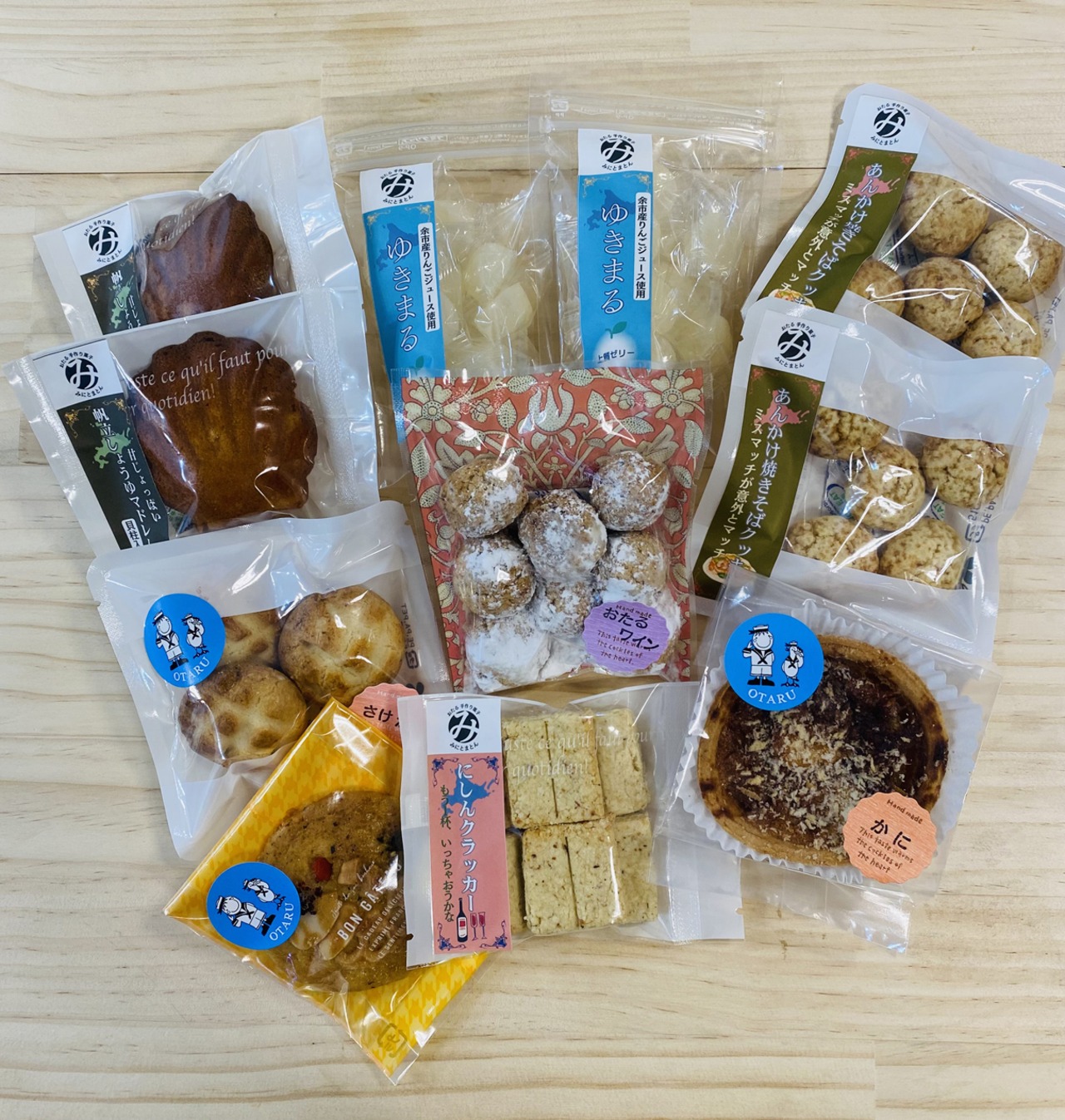 セット内容(箱入り):ゆきまる×2・帆立しょうゆマドレーヌ×2・あんかけ焼きそばクッキー×2・酒粕クッキー×1・ワインレーズンとココナッツのクッキー×1・カニクリームコロッケタルト×1・スープカレークッキー×1・にしんクラッカー×1