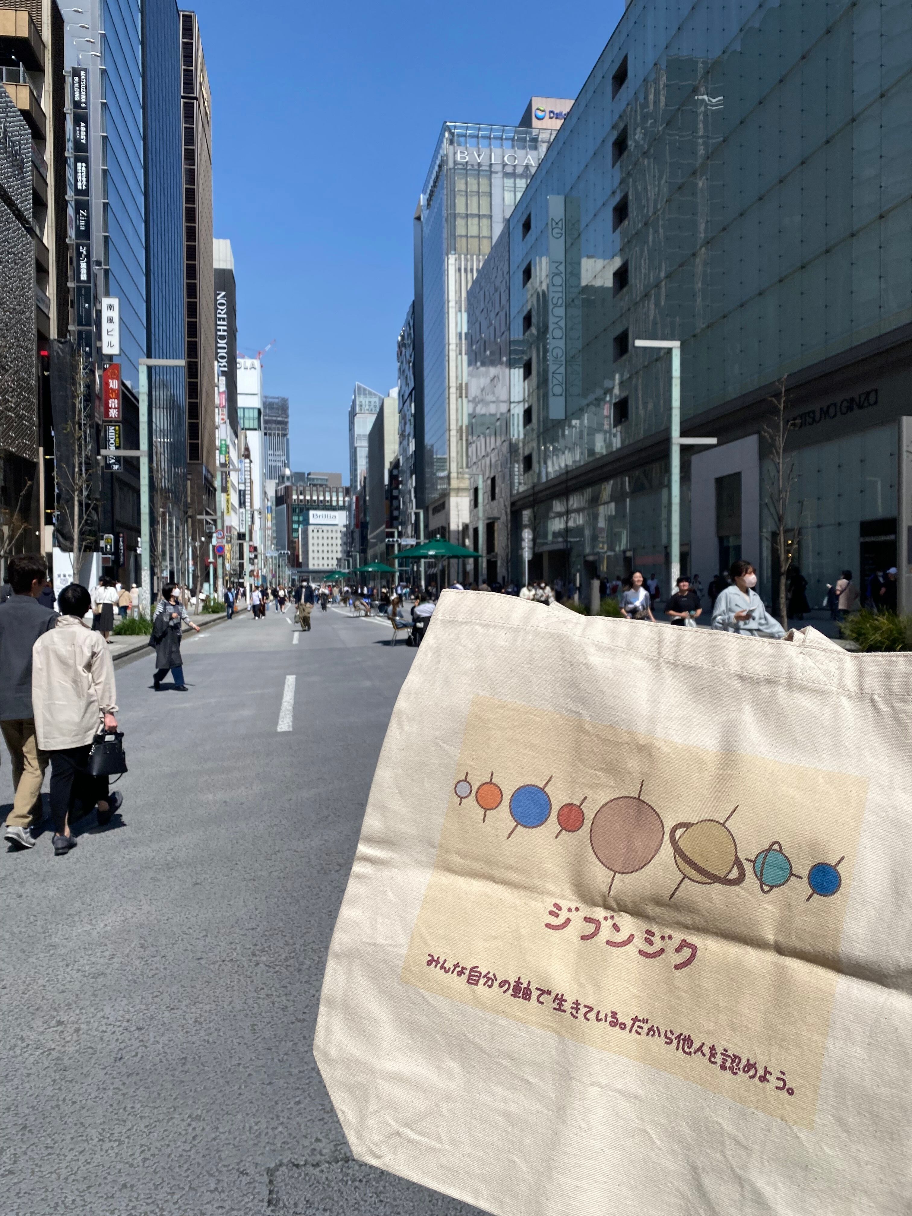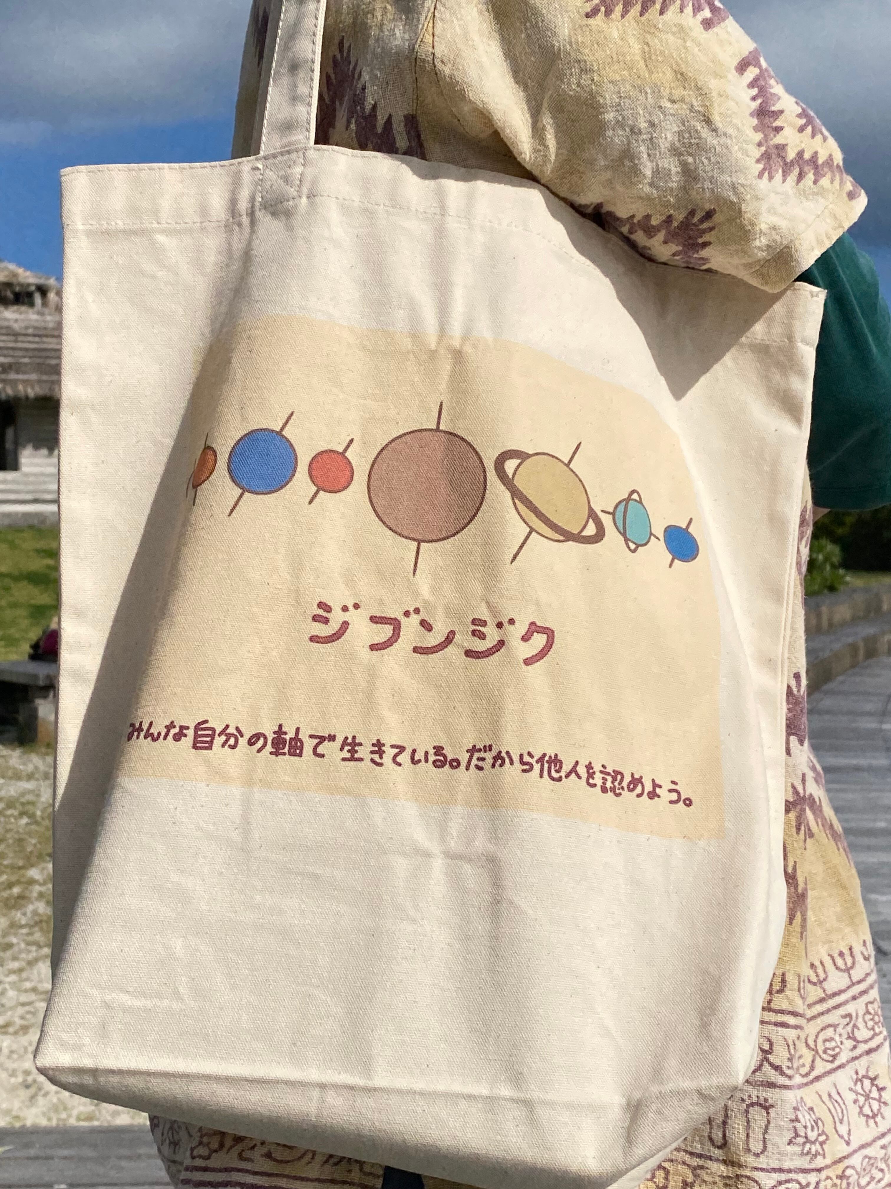 「ジブンジク」は店主が好きな造語です。決して自己中心的という意味ではありません。日々の生活の中で自分とは違った考えを持った人っていますよね。ってか、違った考えの人がいて普通です。「なんでそんなこと発想になるんだろう?」「なんでそんなことするんだろ?」‥、そう感じた時、このトートバッグを見つめてください。水星も、地球も、土星も。みんな【自分の軸】を持っていて時を進んでいるんだよ、ということ。あなたがそう思っているように、他人も自身の考えて生きている。このフレーズを見て元気に街を歩き、そのあなたの持っているトートバッグを見て誰かが癒やされる。そんな日常をつくりませんか?