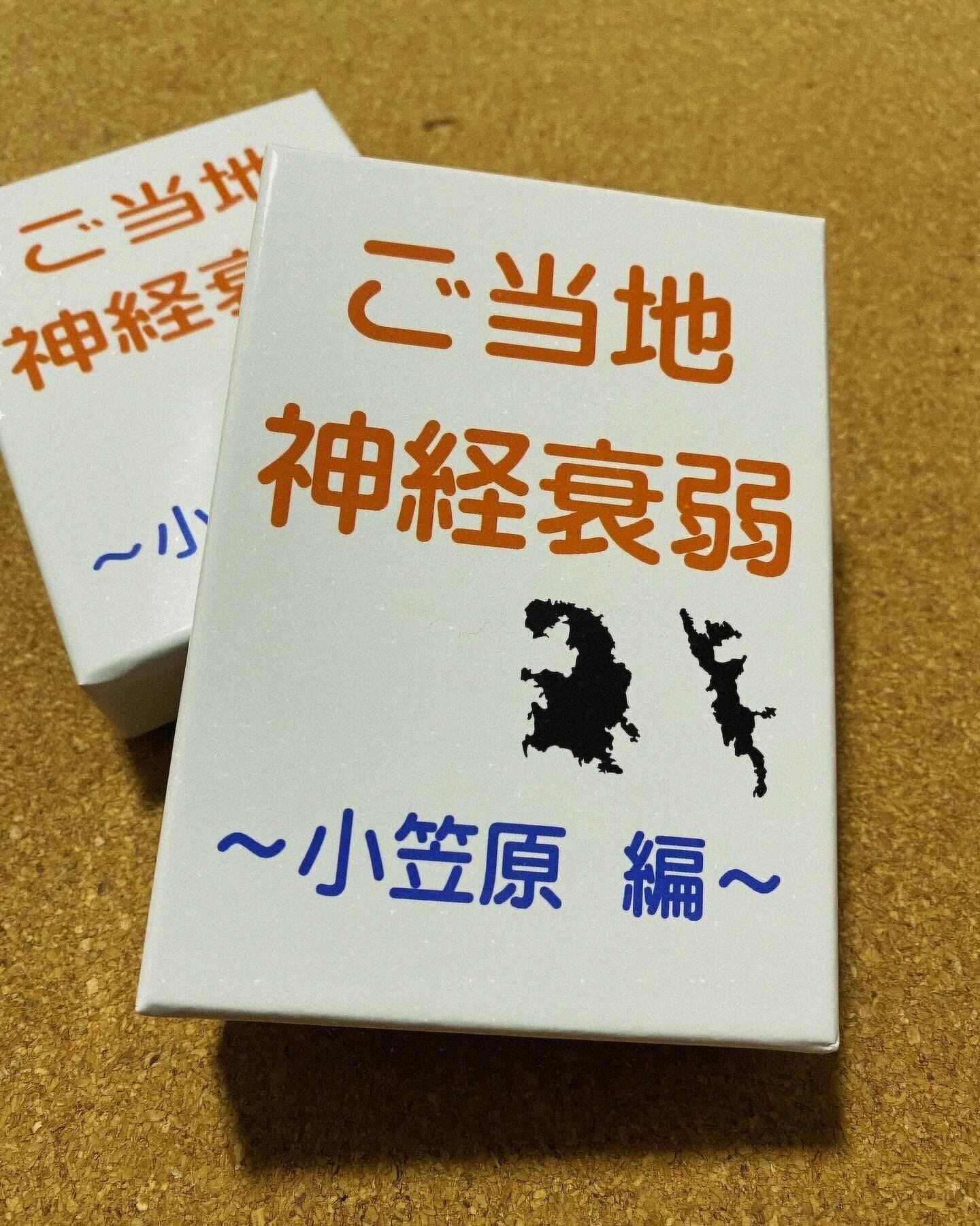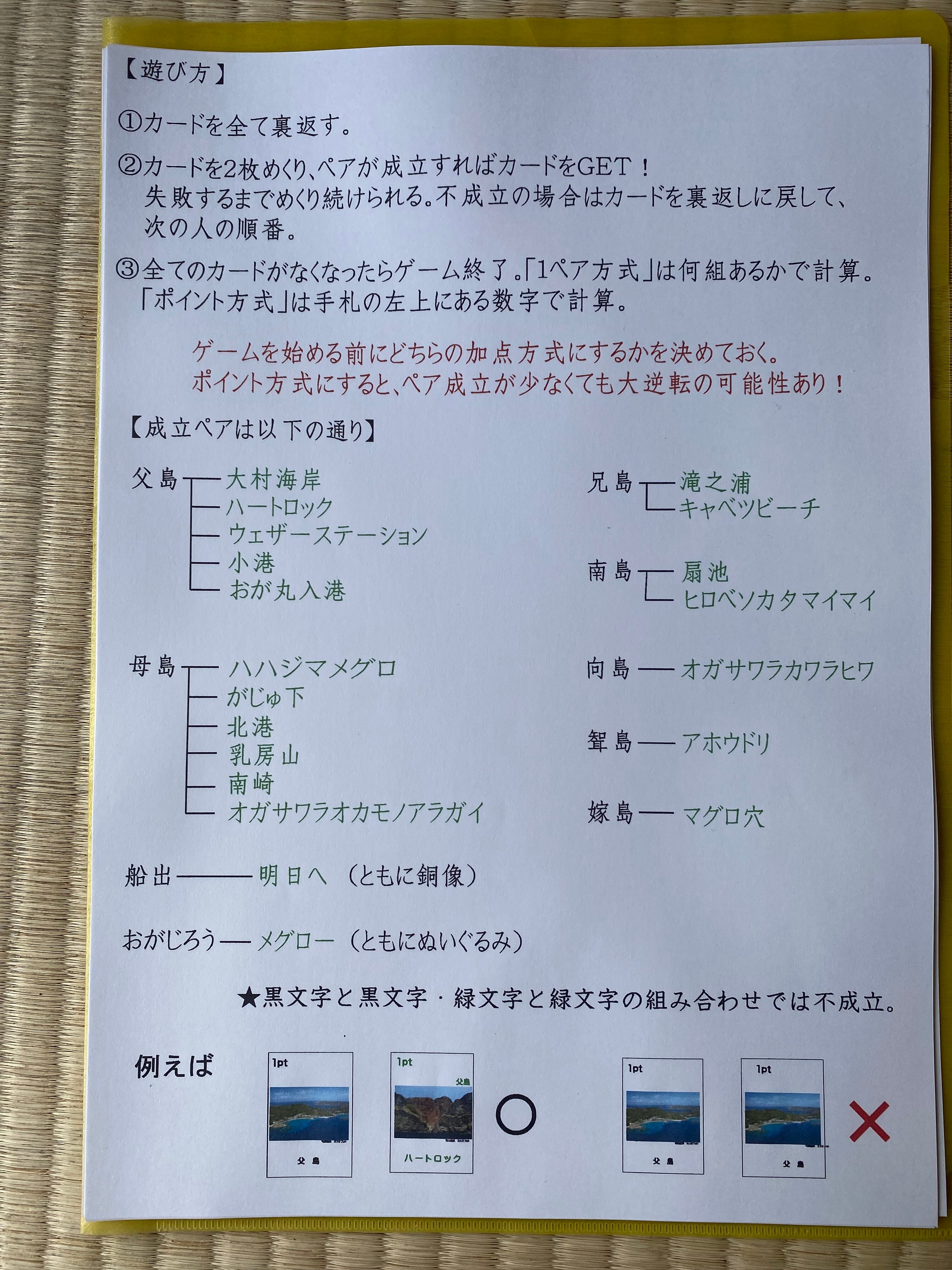 ルールはトランプの神経衰弱と一緒です。だけど選ぶペアが異なるのがこのご当地神経衰弱。例えば「父島」と「父島」カードではなく、「父島」と、関連したカードをひいてポイントになります。父島カードのペアリングは「前浜海岸」だったり「ウエザーステーション」だったり。そう!このカードゲームは島民・元島民・小笠原リピーターさん・そして島に来て目一杯遊んだおがさわら丸の船内で遊べるものです。島を思い出す美しい写真の数々。1回目よりも2回目以降がもっともっと楽しくなるゲームです。